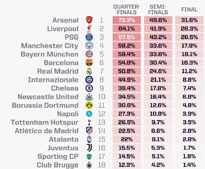 雷速体育10月2日讯 权威统计机构使用超级计算机进行计算后,认为阿森纳是本赛季欧冠的最大热门,利物浦、巴黎、曼城、拜仁、巴萨、皇马、国米、切尔西紧随其后。并给出了各大豪门进展到赛事各个阶段的预测概率,如下表所示。